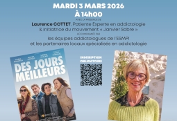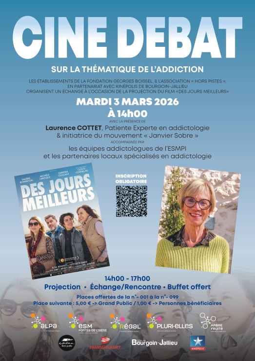 Un échange se déroulera suite à la projection du film "Des jours meilleurs" avec la présence de Laurence Cottet, patiente experte en addictologie et initiatrice du mouvement "Janvier sobre".