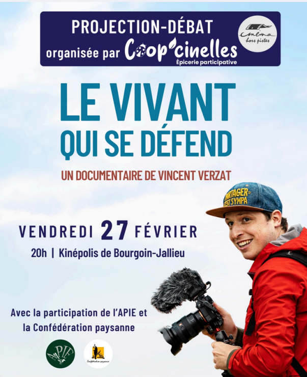 L’épicerie participative Coop'cinelles co-organise avec le Cinéma Hors Pistes de Bourgoin-Jallieu une soirée ciné-débat le 27 février 2026 à 20 h au Kinépolis, autour du documentaire "Le VIVANT qui se défend".