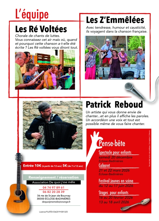 Au programme Les Ré Volté.es (Chorale de chants de luttes), Les Z'Emmêlées (Chansons françaises pleines d'humour et pas que), Patrick Riboud (Un musicien de talent pour vous faire chanter...et oui la guest-star c'est vous.)