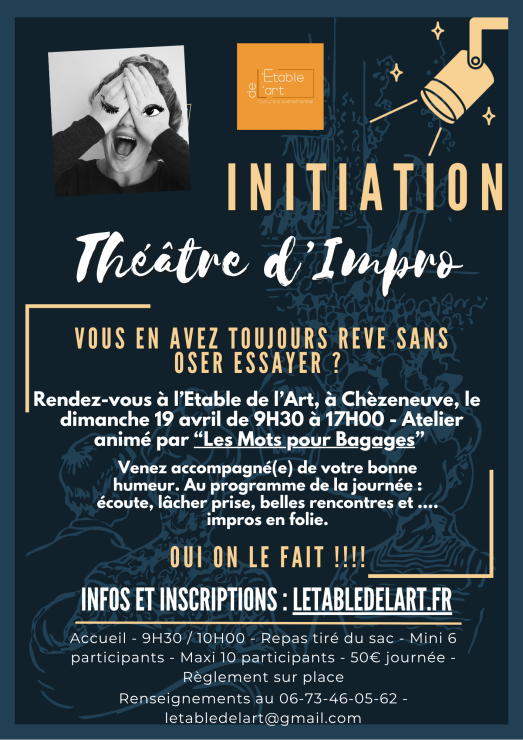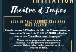 L’impro est à la portée de tous. L’objectif de la journée est de découvrir les outils de base qui vous permettront de mettre en place des impros en vous amusant avec vos camarades de scène. Jouer sans compétition, pour le plaisir d’un moment scénique partagé dans l’éphémère et la spontanéité. N’ayez plus pleur du vide, en impro, l’incertain est votre meilleur allié.
