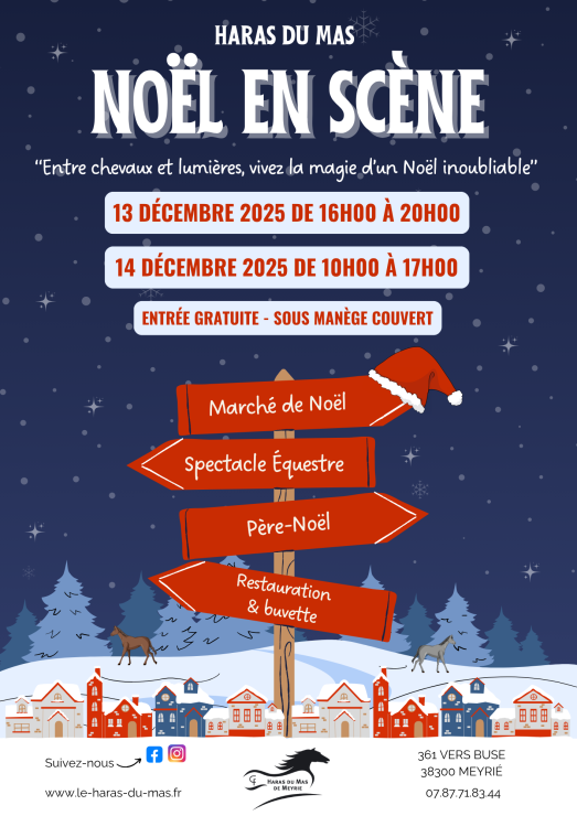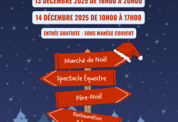 Au programme : un village de Noël avec un Marché de Noël festif, un spectacle équestre, et l’illumination du grand sapin. Vous pourrez également découvrir de nombreux exposants : alimentaire, décoration, créations artisanales et bien d’autres encore.