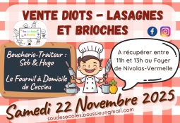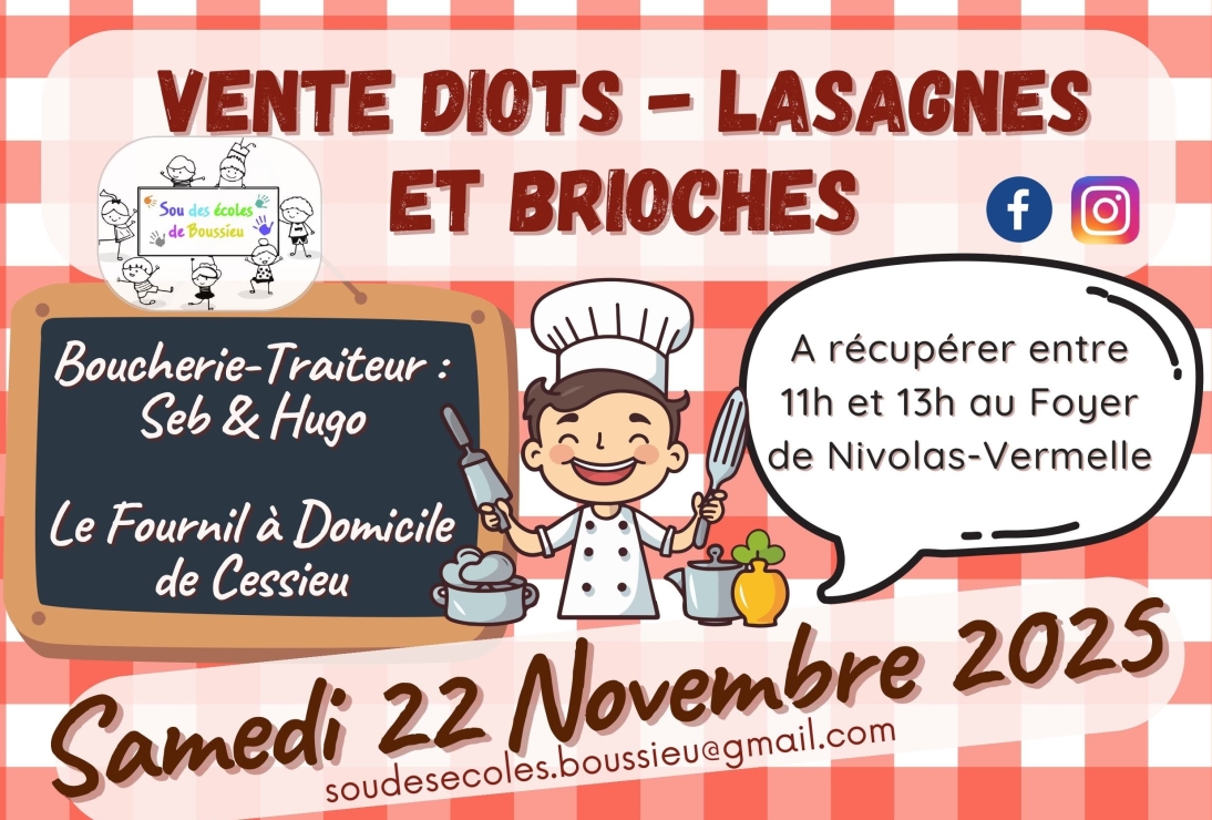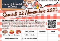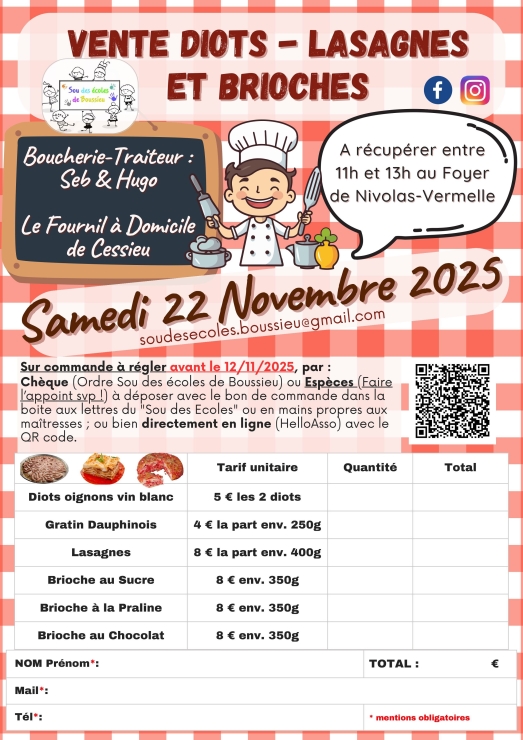 Sur commande à régler avant le 12/11/2025, par chèque (ordre Sou des écoles de Boussieu) ou espèces (faire l’appoint svp !) à déposer avec le bon de commande dans la boite aux lettres du "Sou des Ecoles" ; ou bien directement en ligne sur https://www.helloasso.com/associations/sou-des-ecoles-de-boussieu/boutiques/vente-plats-cuisines-22-novembre-2025
