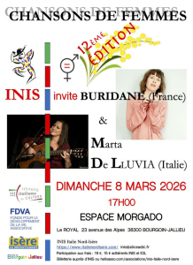 A l'Espace Morgado, Inis invite "Buridane" et "Marta De Lluvia", 2 artistes féminines de qualité pour la 12ème édition de "Chansons de femmes" le Dimanche 8 Mars à 17h.